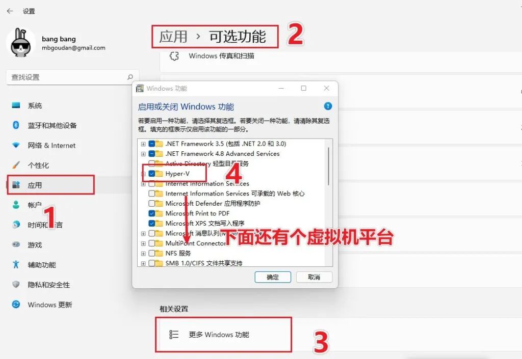 打开电脑设置 — > 应用 — > 可选功能 — > 更多Windows功能 — > 找到【Hyper-V】和【虚拟机平台】两个选项。勾选并确认。然后会进行安装,安装后点立即重启电脑。