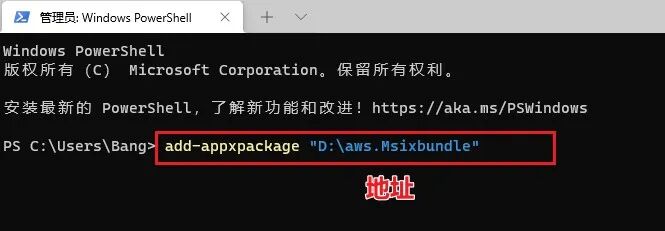 3,在Windows终端输入命令:add-appxpackage + 空格 + 安卓子系统文件地址 然后回车,耐心等待部署完成。add-appxpackage “D:\aws.Msixbundle”