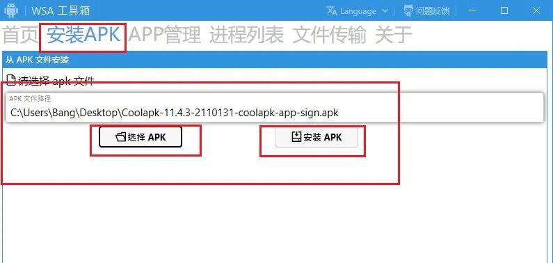 这款工具使用起来超级简单,打开工具,点击安装apk,选择你下载好的安卓app文件,然后点击安装即可。这里推荐大家安装的第一个APP为酷安,你安装好酷安之后,你就可以在酷安里面安装管理其他的APP了。