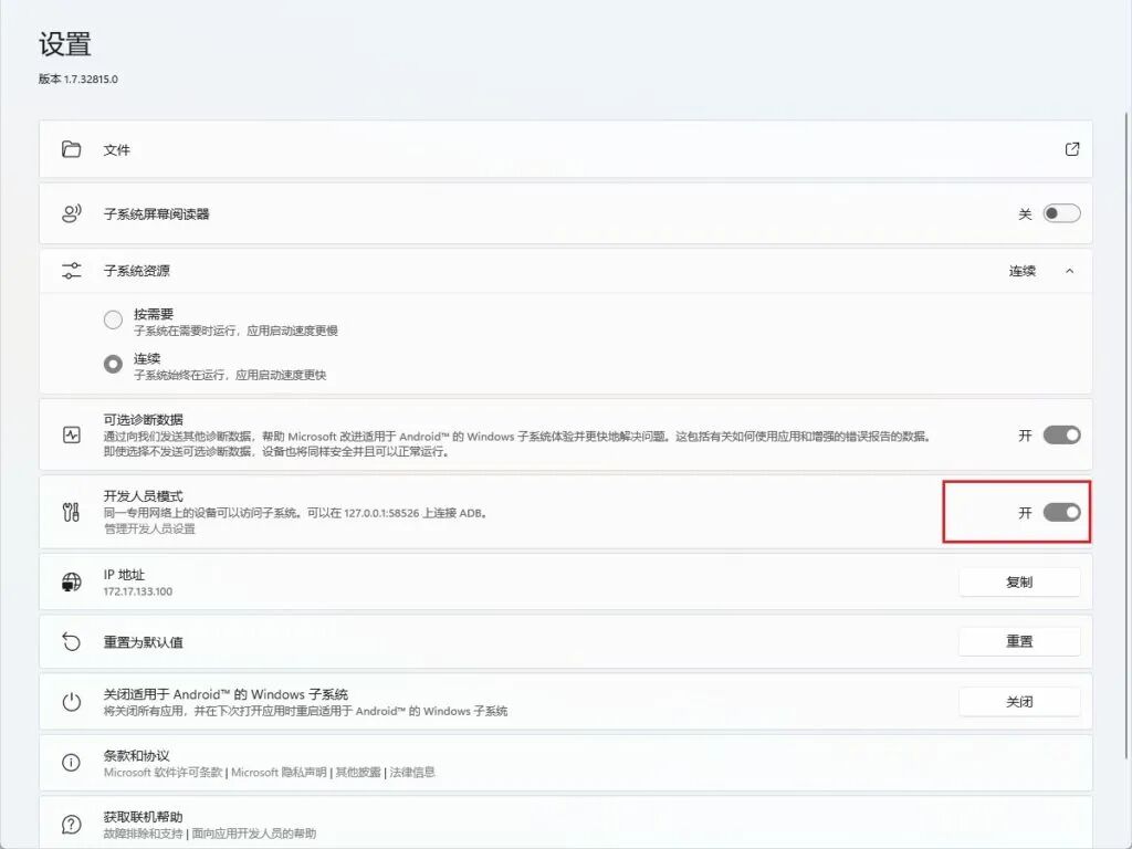 点击即可进入安卓子系统的设置界面,我们先把开发人员模式打开。到这里我们的安卓子系统就已经安装完成了!这里推荐重启一下电脑。