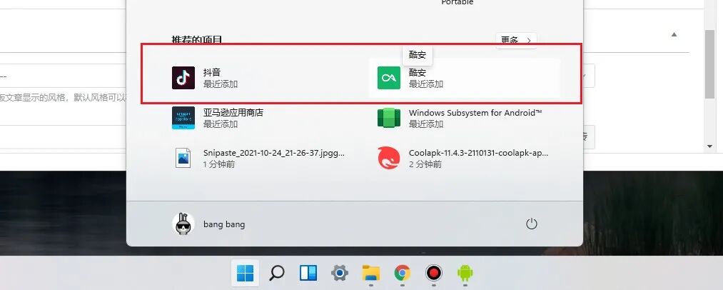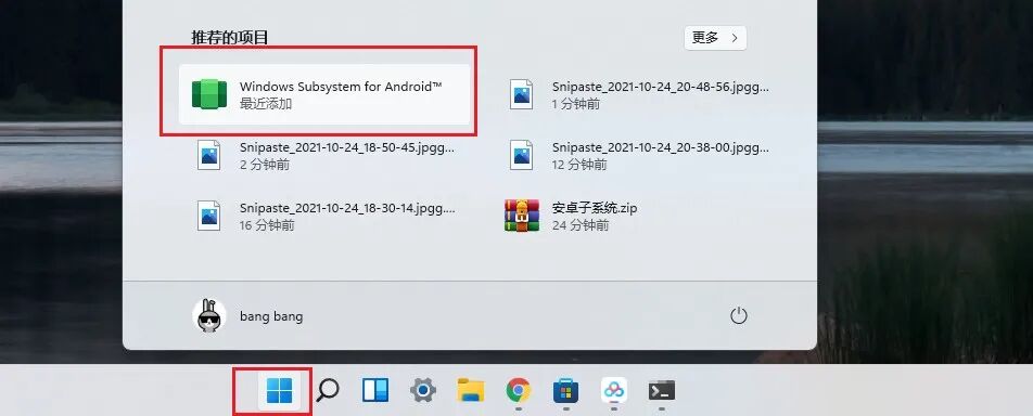 4,部署完成后,打开开始菜单,就会出现:Windows Subsystem for Android 的绿色图标。