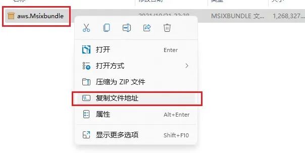 1,将安卓子系统的离线安装包下载下来并解压,然后右键安卓子系统安装包,复制文件地址。
